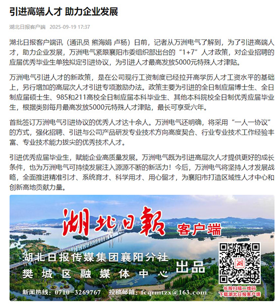 日前,記者從萬洲電氣了解到,為了引進高端人才,助力企業(yè)發(fā)展,萬洲電氣緊跟襄陽市委組織部出臺的“1+7”人才政策,對企業(yè)招聘的應屆優(yōu)秀畢業(yè)生單獨擬定引進協議,為引進人才最高發(fā)放5000元特殊人才津貼。
